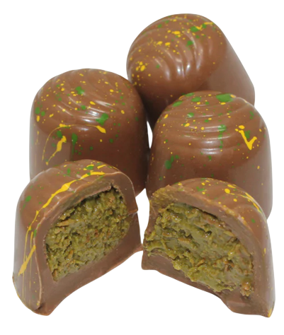 Tahini sesame paste with pistacho nuts in milk chocolate