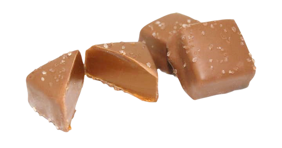 Chewy caramel with fleur de sel in milk or dark chocolate